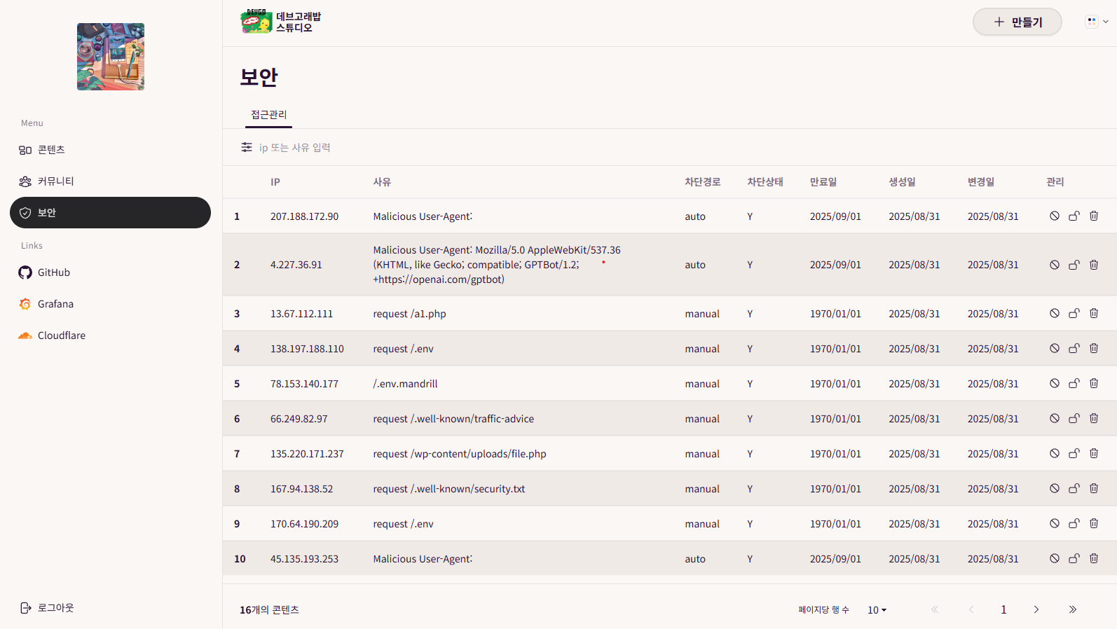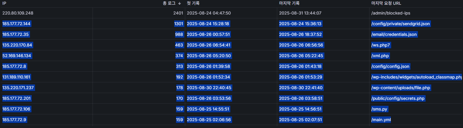 추가한 보안 기능이 예상대로 작동하는 것을 확인했습니다. 기능을 배포한 지 불과 1시간 만에 크롤러 봇, 알 수 없는 에이전트(unknown agent), 악성 경로 요청 등 다양한 비정상적인 접근들이 성공적으로 차단된 것을 로그를 통해 확인했습니다.