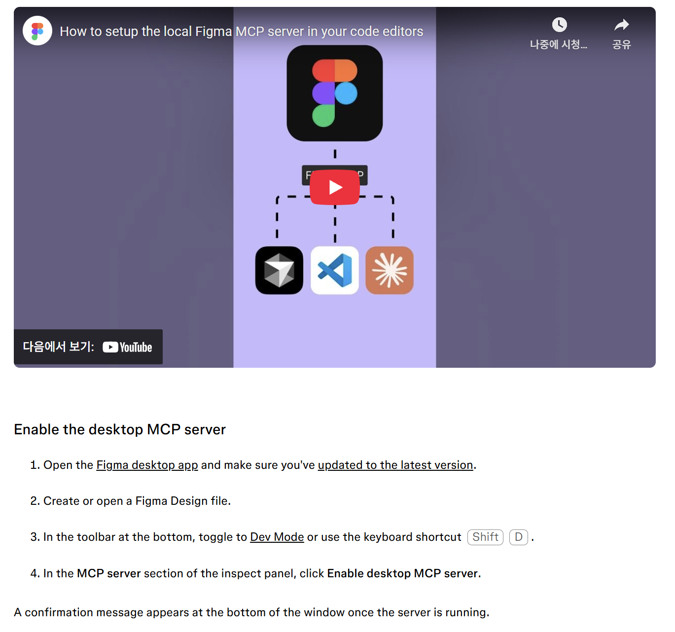 피그마 공식문서에서 피그마 MCP를 사용하는 방법을 쉽게 설명하고 있다.