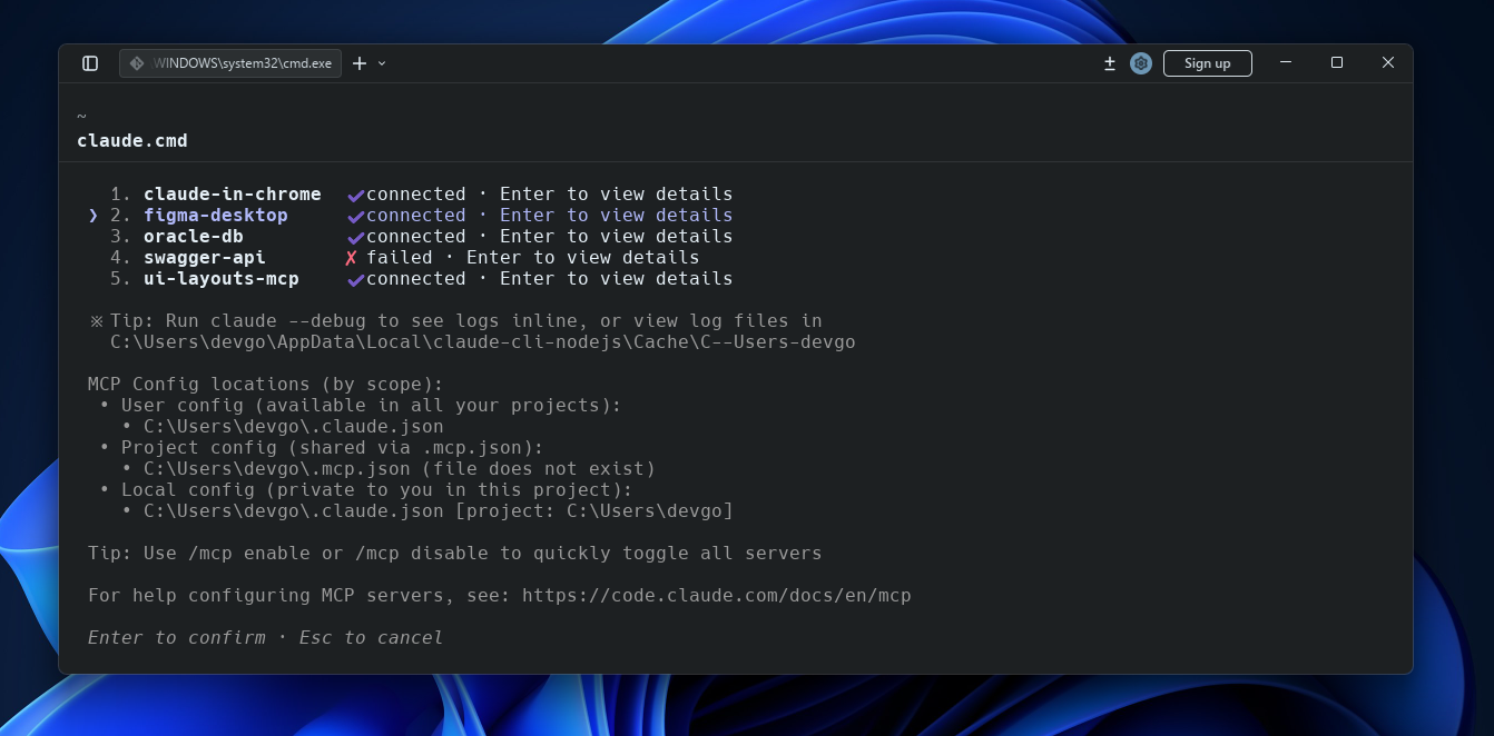 설정 자체는 간단하다. 공식 문서대로 진행하면 Claude MCP 목록에 figma-desktop이 나타난다. 연결에 성공하면 상태가 활성화되고, 피그마 Dev Mode에서 원하는 UI를 선택한 뒤 Claude에게 질문하면 해당 요소에 대해 잘 답해주는 걸 확인할 수 있다.