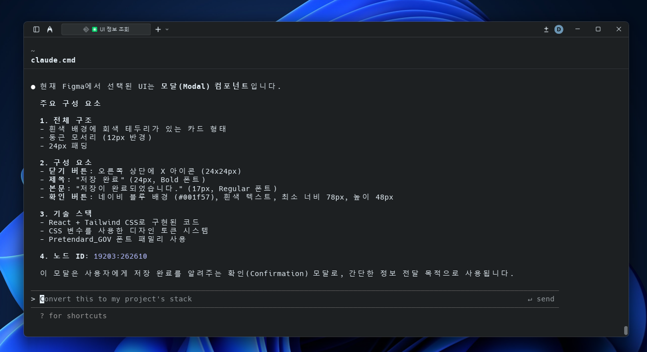 디자인과 프론트엔드 사이의 간극이 확 줄어든 느낌이다. 예전에는 피그마에서 수치를 일일이 확인하고 코드로 옮기는 과정이 번거로웠는데, 이제는 UI를 선택하고 바로 질문하면 된다. "이 버튼 스타일 Tailwind로 만들어줘" 같은 요청에 바로 코드가 나온다. 디자인을 보면서 코드를 작성하는 게 아니라, 디자인에게 코드를 물어보는 느낌이랄까. 단순 반복 작업이 줄어드니 실제 구현 로직에 더 집중할 수 있게 됐다.